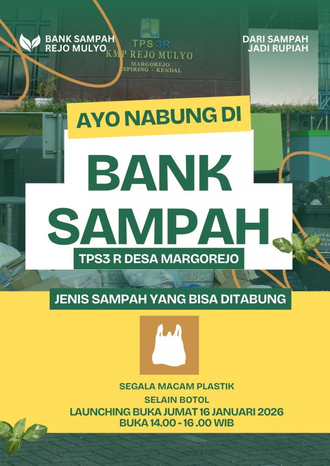 Pemerintah Desa Margorejo melalui BUMDes Muji Berkah akan melaksanakan Launching Bank Sampah Rejomulyo, sebagai upaya mendorong pengelolaan sampah berbasis masyarakat sekaligus meningkatkan nilai ekonomi dari sampah plastik.