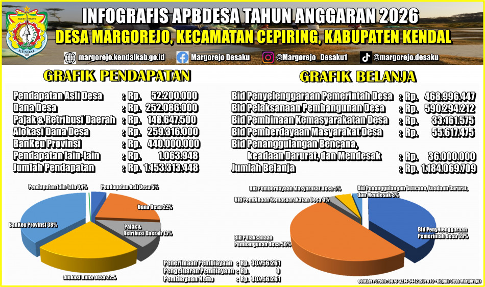 Margorejo – Pemerintah Desa Margorejo, Kecamatan Cepiring, Kabupaten Kendal, telah menetapkan Anggaran Pendapatan dan Belanja Desa (APBDesa) Tahun Anggaran 2026. Berdasarkan infografis resmi yang dipublikasikan, total pendapatan desa pada tahun 2026 mencapai Rp1.153.313.448, sementara total belanja desa sebesar Rp1.184.069.709.