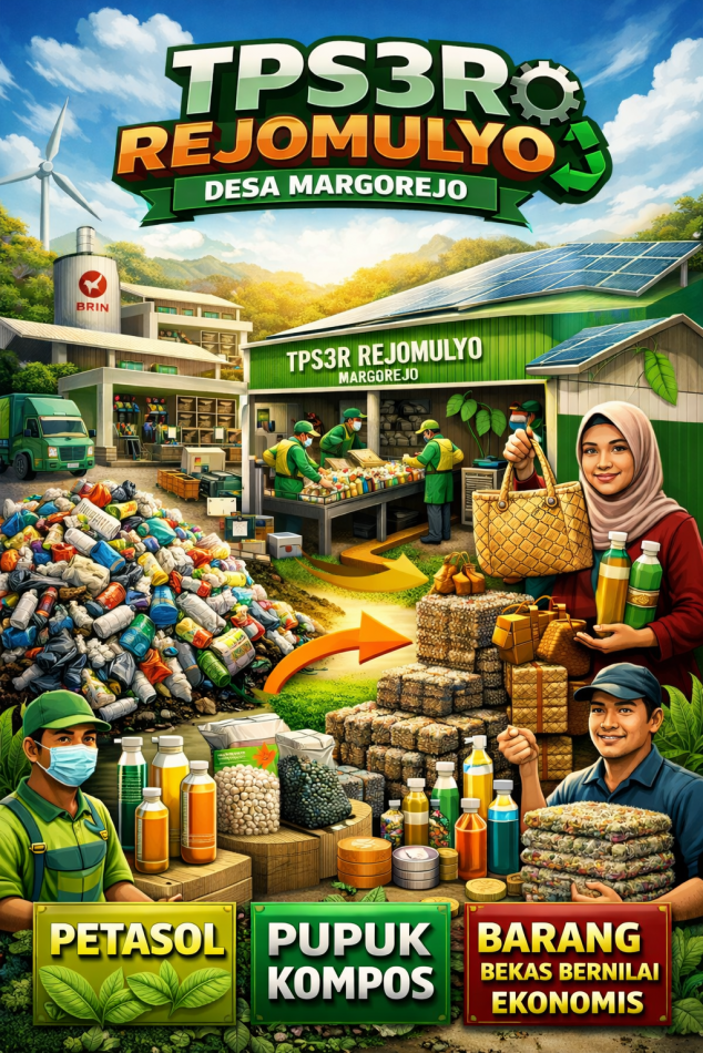 Tidak berhenti di situ, Pemdes Margorejo juga berinovasi dengan menggandeng BRIN dalam pengolahan sampah berbasis teknologi sebagai ikhtiar menuju kemandirian desa.