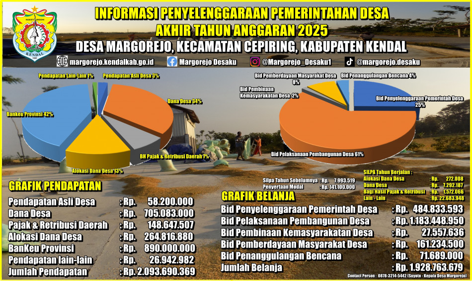 Berdasarkan data yang disampaikan, total pendapatan Desa Margorejo Tahun Anggaran 2025 mencapai Rp2.093.690.369. Pendapatan tersebut bersumber dari berbagai pos anggaran, dengan rincian sebagai berikut: